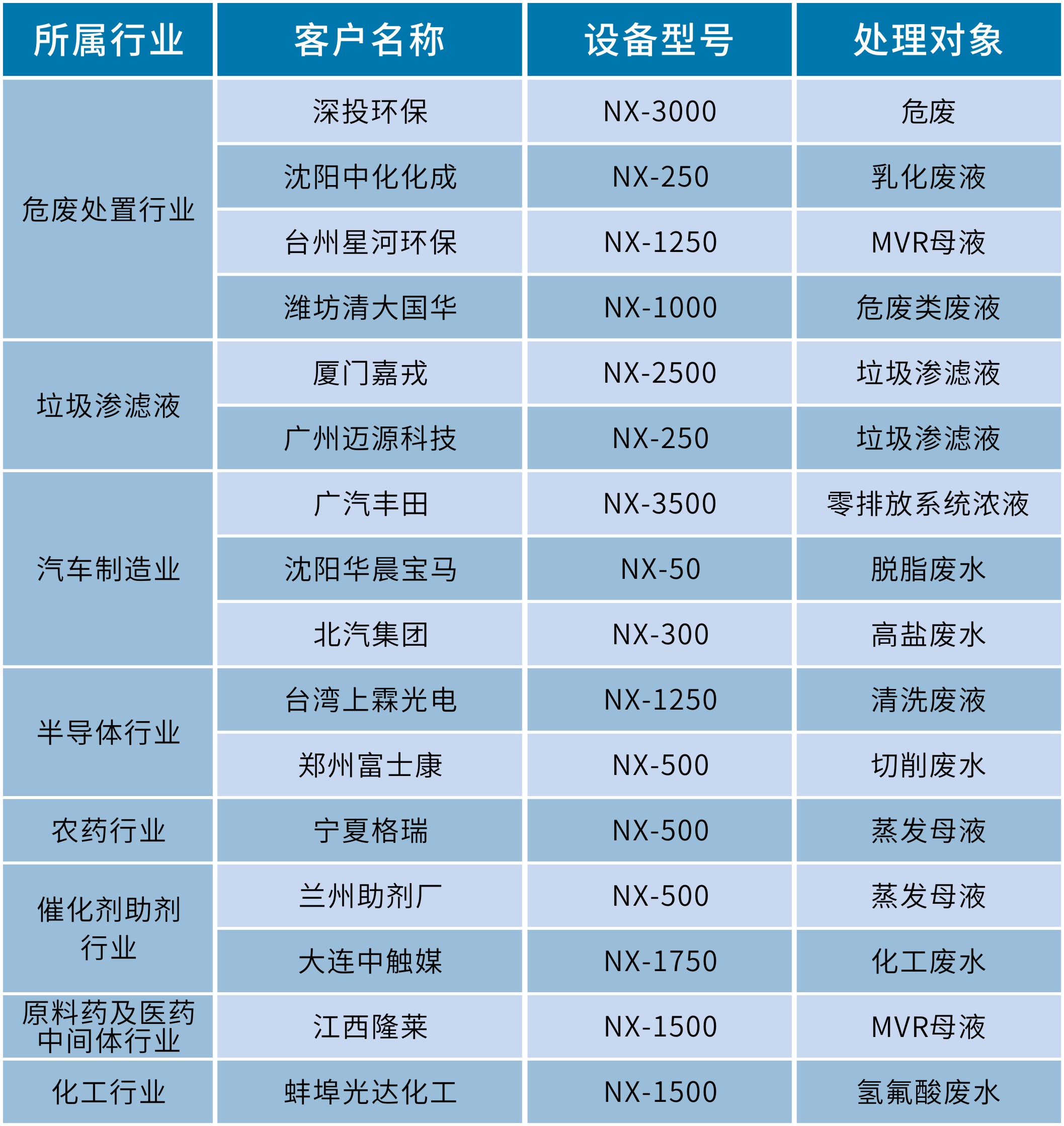 國內(nèi)超過120個案例,涵蓋多個行業(yè),包括危廢處置行業(yè)、化工行業(yè)、醫(yī)藥行業(yè)、汽車制造行業(yè)、垃圾滲濾液處理等等